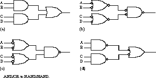 AND/OR Conversion to NAND/NAND Networks Consider the simple gate network in Figure 3.4(a). Let's replace the first-level AND gates by their NOR equivalents and the OR gate by its NAND equivalent. The equivalent circuit is shown in Figure 3.4(b). Note that the output inversion at the first-level gates matches the input inversion at the second level. These cancel each other out, as shown in Figure 3.4(c). Both the first- and second-level gates are NAND. Unfortunately, this does not properly conserve the bubbles at the first-level inputs and the second-level outputs. This is corrected in Figure 3.4(d), where we have replaced the NAND gates with their equivalent forms. Now the bubbles are properly matched.