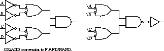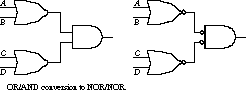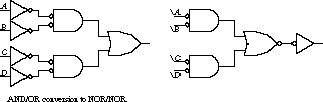 AND/OR Conversion to NOR/NOR Networks Suppose you are now restricted to mapping the AND/OR network into a NOR-only network. As a shortcut, you can simply replace the first-level AND gates with NOR gates (AND with inverted inputs) and the second-level OR gate with a NOR gate.