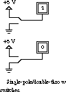 Figure 3.45 shows the SPDT switch configuration. One connection point is wired to the power supply and the other is connected to ground. The switch can be placed in one of two positions. When in the up position, the switch connects the power supply to the output node. The output node is driven to a logic 1 voltage. In the other position, ground is connected to the output. Now the output node is driven to a logic 0 voltage.