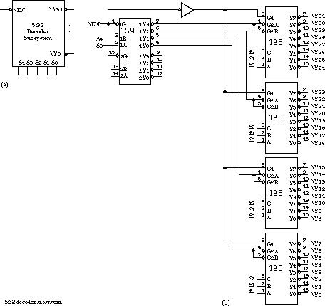 Figure 4.47 shows one possible strategy, implemented with a 2:4 decoder and four 3:8 decoders. The single active low enable signal directly enables the 2:4 decoder. It is inverted to provide the active high enable signals to the four 3:8 decoders. The active low outputs from the 2:4 decoder are wired directly to the enable signals of the second-level decoders. Only one of the 3:8 decoders is enabled, based on the selection inputs S4 and S3. And only one of this decoder's outputs will be enabled, based on the selection inputs S2, S1, and S0.