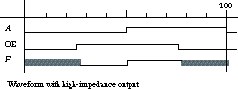 Figure 4.49 gives a timing waveform for a buffer with a tri-state output. The input signal A changes from 0 to 1 and back between time unit 0 and 100. The OE signal is asserted between time units 25 and 75. A high-impedance output is represented by a patterned waveform, as shown in the figure. When OE is low, F is in its high-impedance state, regardless of the value of A. When OE is high, F outputs the same value as that presented at A.