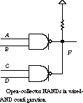 Figure 4.55 shows two open-collector NAND gates in what is called a "wired-AND" configuration. When both inputs to the NAND gate are 1, the output is low and node F is pulled low. In the other input configurations, the gate's output floats and is pulled up to 1 by the resistor.
