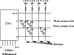 Figure 4.60 shows the ROM in more detail. The n-input address decoder asserts one of the 2n selection lines. These are also called word lines. Each vertical wire, representing an output from the ROM, is called a bit line. You can think of the bit lines as being connected to open-collector inverters. A transistor controlled by the word line pulls down the bit line if a zero is to be stored in that word. If there is no pull-down transistor for that word and bit line, a one is stored instead. Based on the placement of the pull-downs, the wordi contains the value 0011 while wordj stores 1010.
