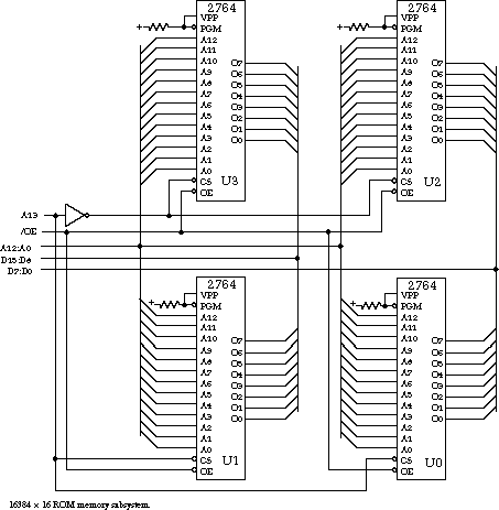 The high-order address bit, A13, selects between the higher 8192 ROM words (addresses 8192 through 16383) and the lower 8192 words (-addresses 0 through 8191). Address line A13, if low, enables U1 and U0. If high, it enables U3 and U2. The remaining address lines, A12:A0, are wired directly to the address line inputs of the ROM chips, as is the output enable signal. The output of the ROM will be driven only if the chip is -selected and the output is enabled. Because the outputs are tri-stated and the upper and lower ROM chips are never asserted at the same time, it is perfectly -acceptable to wire their outputs together. U3 and U1 are connected to D15:D8, while U2 and U0 are connected to D7:D0.