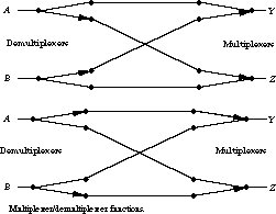 The figure shows connection paths between A and Z and B and Y. When the control settings are changed, the paths connect A to Y and B to Z. Once again, the structure looks just like the switches in a railroad yard.