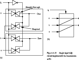We'll call the upper of these the "straight-through" transmission gate, and the lower the "diagonal" transmission gate. Depending on the setting of the control signals, the inputs can be steered straight through the network or can be shifted diagonally. The steering paths can be seen more clearly in the block diagram of Figure 4.20(b).