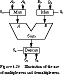 Figure 4.26 shows how these components could be used in a simple adder subsystem. There are two sources for each of the adder's inputs A and B and two destinations for the resulting sum. The control input Sa chooses between the inputs A0 and A1, while Sb selects between B0 and B1. For example, to add A0 to B1, we would set Sa = 0 and Sb = 1. By placing the appropriate signal on Ss, the sum can be connected to one of the output nodes S0 or S1.