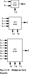 Multiplexers are described by the number of data inputs, since you can infer the number of control inputs from this. Thus, a 2:1 multiplexer has two data inputs, one data output, and one control input, while a 4:1 multiplexer has four data inputs, one output, and two control inputs. Figure 4.28 contains block diagrams for 2:1, 4:1, and 8:1 multiplexers. The Boolean equations for the 4:1 and 8:1 multiplexers generalize from the equation for the 2:1 multiplexer: