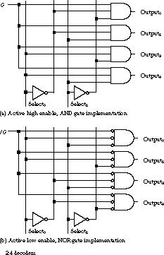 Figure 4.41 gives two implementations, one with AND gates and one with NOR gates, for a 2:4 decoder. The inverters generate the four possible combinations of the two select lines: