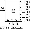 Decoder/Demultiplexer as a Logic Building Block A decoder can also be viewed as a "minterm generator." Figure 4.43 shows a block diagram of a 3:8 decoder where the select lines are labeled with the signals A, B, C. Each output can be labeled with the select line combination that causes that output to be asserted. For example, suppose the control signals A, B, and C are set to 0, 1, and 0, respectively. This corresponds to the minterm