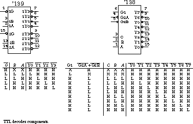 Figure 4.45 shows two TTL decoder components, the 74139 dual 2-line to 4-line decoders/demultiplexers and the 74138 3-line to 8-line decoder/demultiplexer. We begin by discussing the 74139. A close examination of the schematic indicates that the enable signal