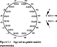 Figure 5.1 depicts a "number wheel" representation of our 4-bit number system. The figure shows the binary numbers and their decimal integer equivalents, assuming that the numbers are interpreted as sign and magnitude. The largest positive number we can represent in three data bits is +7 = 23 - 1. By a similar calculation, the smallest negative number is -7. Zero has two different representations, even though +0 and -0 don't make much sense mathematically.