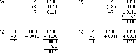 Adding two positive numbers, case (e), gives the same result as before. This should not be too surprising, since positive numbers are represented in the same fashion in all three systems.