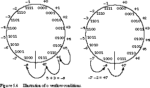 This concept is illustrated in Figure 5.4, with the two example calculations 5 + 3 and -7 - 2. On the number wheel, starting with the representation for +5, we advance three numbers in the clockwise direction. This yields -8; an overflow has occurred. Similarly for subtraction. Starting with the representation for -7, we move two numbers in the counterclockwise direction, obtaining the representation for +7. Once again, we have an overflow.