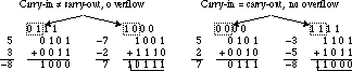 The carry-ins are shown at the top of each column of bits. In the first calculation, 5 + 3, the carry-in to the high-order bit is 1 while the carry-out is 0. In the second calculation, -7 + -2, once again the carry-in to the final bit is different from the carry-out. In two cases in which overflow does not occur, 5 + 2 and -3 + -5, the carry-in and the carry-out of the final stage are identical.