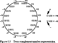 Figure 5.3 shows how the twos complement numbers are derived from the ones complement representation. We've taken the negative numbers and shifted them one position in the clockwise direction. This allows us to represent one more negative number, -8, than we were able to represent in ones complement. The negative numbers still have a 1 in their highest-order bit, the sign bit.