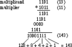 The process of binary multiplication is best illustrated with an example. In this case, the multiplicand is 11012 (13) and the multiplier is 10112 (11):