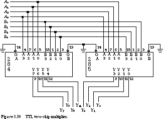 Figure 5.30 illustrates their use. The 74284 component implements the high-order 4 bits of the product, while the 74285 implements the low-order bits. Both chips have dual active low output enable signals,