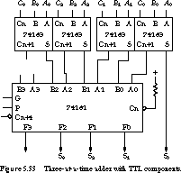 Figure 5.33 shows how the logic of Figure 5.32 can be implemented with TTL components. The first-level full adders are provided by 74183 dual binary adders. The second-level adders are implemented by a 74181 arithmetic logic unit, configured for the adder function. This has the extra performance advantage of internal carry look-ahead logic. Note that the ALU block is written in its positive logic form, with positive logic data inputs and outputs and negative logic carry-in and carry-out.