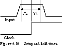 These concepts are shown in Figure 6.10 for a rising clock edge event. The input must remain stable at least a setup time before the reference clock edge and at least a hold time after the edge for the input signal to be recognized as a logic 1. If these constraints are not satisfied, the input may be interpreted as a 1 or a 0 or some unrecognizable value between 0 and 1. It is extremely dangerous to allow input signals to change very close to the sampling event, as we shall see in Section 6.4.