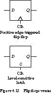 Timing Examples To better understand the terms just introduced, let's consider two memory elements: a positive edge-triggered flip-flop (such as a TTL 74LS74) and a level-sensitive latch (such as a 74LS76). Each has a single data input D, a clock input C, and an output Q. The block diagrams are shown in Figure 6.12.