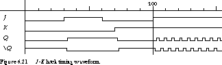 are gated across to the second stage, causing its output Q to go high. On the next rising clock edge, J and K are both low, so the first stage holds its state. Midway through the clock period, however, K comes high, causing the first stage to reset. The 0 output is passed on to the second stage, whose output goes low after the falling edge of the clock.