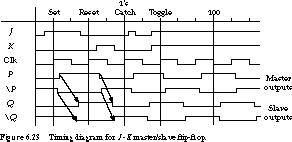 The ones catching phenomenon is clearly shown in the next input con-dition, where J changes from low to high to low while the clock is asserted. Even though the input is back to zero by the time the clock goes low, the output is still set. You must be careful when using master/slave flip-flops with combinational logic that suffers from 0-hazards. Any glitch at the inputs to the flip-flops could cause unintended state changes.