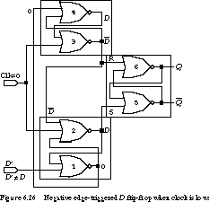 Figure 6.26 shows the state when the input changes to D', which is different from the previously sampled value D. This new input forces the output of the NOR gate to change from 1 to 0, since one input must be a 1 and the other a 0. By driving this circuit node to 0, gates 2, 4, and 5 are guaranteed to hold their previous values. D' can affect the circuit only when the outputs of gates 2 and 4 are forced to 0. This will happen only when the clock next goes high.
