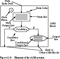 Each major unit, called an ASM block, consists of a state box and, optionally, a network of condition and output boxes. A state machine is in exactly one state or ASM block during the stable portion of the state time.