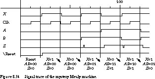 Figure 8.34 gives the timing waveform that corresponds to the input sequence 10101, after a reset to state 00. In state 00, reading a 1 keeps the machine in state 00 (time step 40).