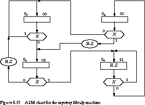 The missing transitions are from state 01 to 00 on input 0, 10 to 00 on input 0, and 11 to 11 on input 1. The respective outputs are 1, 0, and 1. Assuming that S0, S1, S2, and S3 correspond to encoded states 00, 01, 10, 11, we show the ASM chart for the mystery machine in Figure 8.37.