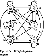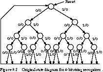 Figure 9.2 shows the state diagram. There are 16 unique paths through the state diagram, one for each possible 4-bit pattern. This adds up to 15 states and 30 transitions. We highlight the paths leading to recognition of the strings 0110 and 1010 in the figure. Only two of the transitions have a 1 output, representing the accepted strings.