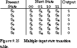 Let's consider the state diagram for a two-input Moore machine shown in Figure 9.14. Each state has four next-state transitions, one for each possible input condition. The derived state transition table is given in Figure 9.15.