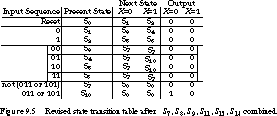 Next we examine the rows of the state transition table to find any with identical next-state and output values (hence the term "row matching"). For this finite state machine, we can combine S10 and S12. Let's call the new state S10' and use it to rename all transitions to S10 or S12. The revised state table is shown in Figure 9.4.