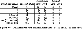 Now states S3 and S6 can be combined, as can S4 and S5. We call the combined states S3' and S4', respectively. The final reduced state transition table is shown in Figure 9.6.