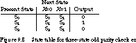 Figure 9.8 shows the state table for the three-state odd parity checker of Figure 9.1. Although states S0 and S2 have the same output, they do not have the same next state. Thus, they cannot be combined by simple row matching. The problem is the self-loop transitions on input 0. If we combined these two states, the self-loop would be maintained, but this is not found by row matching. We need another, more rigorous method for state reduction.