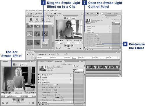 You might also want to experiment with the Strobe Operator settings, which perform calculations on the colors in the clip to create different effects. The Xor option pops in a negative of the screen image rather than a white or colored flash at regular intervals.
