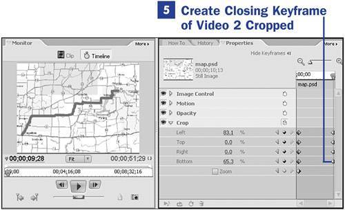 TIP For added effect, add synchronized motion to your two map clips. Before you apply the Crop effect, create a motion path by increasing the plain map's scale to zoom in to one area and then panning across the route of travel as described in 85 Make a Car Move Across a Map. Right-click the plain map clip in Video 2, select Copy, and then right-click the map clip with the line on Video 1 and select Paste Attributes. The motion path from the clip in Video 2 is copied to the clip in Video 1. | 5. | Create Closing Keyframe of Video 2 Cropped