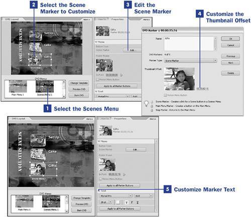 116. Customize an Image As a Chapter Marker BEFORE YOU BEGIN 111 About Burning to DVDs 114 Set DVD Chapter Markers 115 Auto-Generate Scene Markers SEE ALSO 117 Customize a DVD Menu Screen Template 119 Create a Motion Menu 122 Preview and Test Drive a DVD Movie 123 Burn Multiple Copies of a DVD 124 About Troubleshooting DVD Output Scene buttons, which are automatically generated by Premiere Elements and linked to your DVD scene markers, appear on your scenes menu as visual indicators of where the links will take the viewer in the DVD movie project. (For information on how to select and create a DVD menu, see 117 Customize a DVD Menu Screen Template.) 116. Customize an Image As a Chapter Marker  By default, these markers include a thumbnail showing the frame of the video at which you placed your DVD scene marker. You can customize the image that appears as the thumbnail without changing the location of the marker. 1. | Select the Scenes Menu