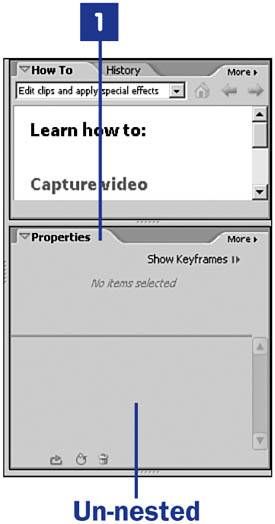 If you want to have a particular panel floating rather than in another panel, Premiere Elements allows you to do that also. Drag the panel, as described in step 1, to the top of your screen (the taskbar area) and drop it there. That's all there is to it. Now you have a free-floating panel you can move anywhere on the screen. Just be careful where you drop it, or you will nest it within another panel.