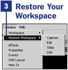 The ability to restore your workspace will come in handy on more than one occasion, I'm afraid. As you start moving things around, panels begin to hide themselves or end up in places other than where you want them. In that case, you can always restore the workspace to its default appearance. Choose Window, Restore Workspace and then click the workspace you want to restore (Capture, Edit, Titles, or DVD).