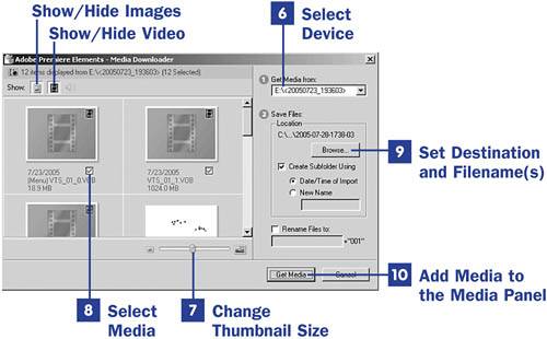 To add media that's located on a DVD, digital camera, or a removable drive, click the Add Media button and select From DVD Camera or Removable Drive. This command takes you to the Adobe Media Downloader dialog box.