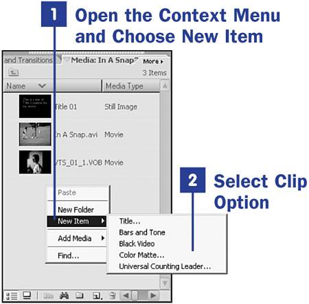 15. Add Special Media Clips BEFORE YOU BEGIN 13 About the Media Panel SEE ALSO 34 Trim a Clip on the Timeline 72 Control a Video Track's Opacity over Time 93 Show Your Video Through a Shape or Text Premiere Elements comes with four clips that will become quite valuable to you and your movies. The clips include Bars and Tone, Black Video, Color Matte, and a Universal Counting Leader. 1. | Open the Context Menu and Choose New Item