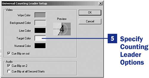You can change the color of any object on the counting leader screenfrom the target to the number and the wipe. To select a new color for that object, click the color box next to the object's name. The Color Picker appears, offering you a choice of millions of colors. Because you can select a different color for each of the objects (Wipe Color, Background Color, Line Color, Target Color, and Numeral Color), the combinations are limitless. You can also set the audio cue blipsthe little blip noises you hear during the countdown. The options are Cue Blip on Out, Cue Blip on 2, and Cue Blip on all Second Starts. The counting leader clip is a fun clip to play around with.