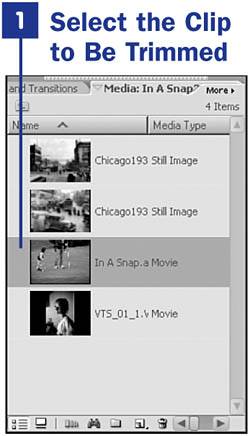 Click the clip in the Media panel that you want to trim. This action highlights the clip. Double-clicking the clip in the panel also works; the clip opens in the Monitor panel. You can also drag the clip to the Monitor panel and drop it there. (If you double-click or drag and drop the clip, continue with step 3.)