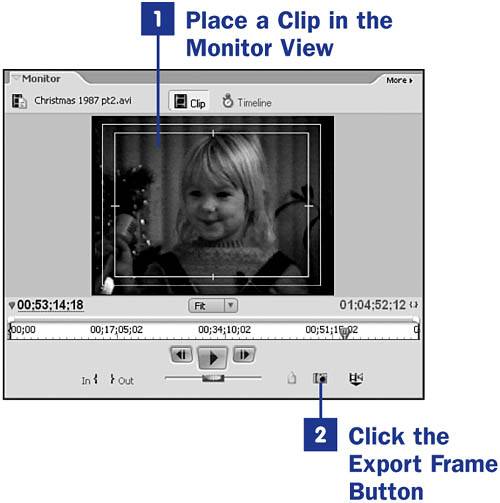 Select the clip from which you want to grab the still image. You can select a clip from the Media panel or one from the Timeline. Select the clip and click the Clip View button at the top of the Monitor, or simply double-click the clip. The clip appears in the Monitor view. Scrub through the clip to locate that one frame that is a keeper by using the VCR and shuttle controls. When the image you want to grab appears in the Monitor view, continue with step 2.