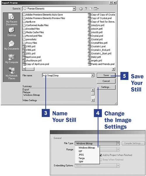 Click the Settings button to open the Export Frame Settings dialog box. From the File Type drop-down list, select the format in which you want to save the still image: Windows Bitmap, GIF, JPEG, Targa, or TIFF. Depending on your selection, other options become available.