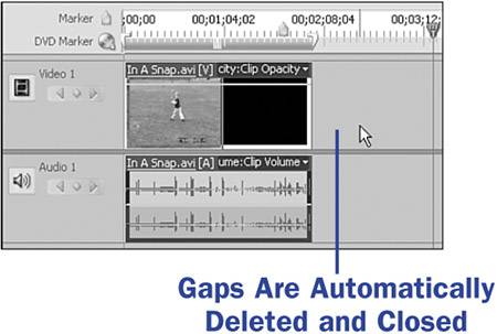 NOTE As you trim your clips, the clips automatically move to the left on the Timeline to close any space or gaps. (see 35 Delete and Close Gaps in the Timeline). If your trimming has left gaps in the Timeline, Premiere Elements automatically deletes and closes any gaps. In the example you just completed, the clip was moved back to the beginning of the Timeline, even though you trimmed 10 seconds from that end.