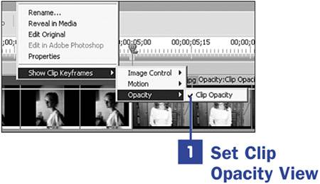 Make sure you have two clips side by side on the same track on the Timeline. Right-click each of these clips and make sure the Clip Opacity option is checked in the clip's context menu. This is the default setting, so if you haven't changed from the default, this option should already be checked. If it is not, select it by simply clicking Clip Opacity. In doing this, you can later see the modifications Premiere Elements has made to your clip's opacity. Opacity is another word for transparency; if a clip has 0% opacity, it is 100% transparent and therefore is invisible; at 100% opacity, it is 0% transparent.