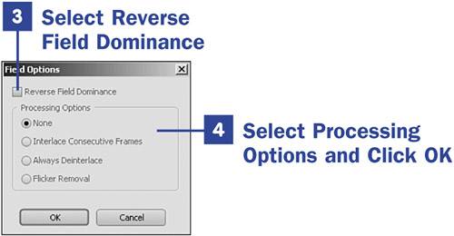 Choose None if you do not want to process the clip's fields. Choose Interlace Consecutive Frames to convert progressive scan frames to interlaced fields. Choose Always Deinterlace to convert interlaced fields into progressive scan frames. The fields are determined by the Fields Setting option, accessed from the Project, Project Settings, General menu command. Choose Flicker Removal to keep the image from flickering by blurring the two interlaced fields together. (In interlaced clips, some parts of images appear only in every other field, resulting in flickering. This is most prevalent with very thin horizontal details in still images.) NOTE For more details on flicker removal, see 25 Remove Shimmer from a Photo. After you have made the appropriate selections for your video clip, click the OK button. You might have to apply various combinations and test each one before getting the results for which you are looking.